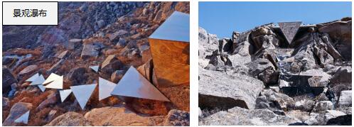 鏡面不銹鋼制成的倒三棱錐,錯(cuò)落置于山坡上,椎體表面鋼板較薄產(chǎn)生形變,呈現(xiàn)出一種微妙的介于隱形與顯形之間的狀態(tài)。